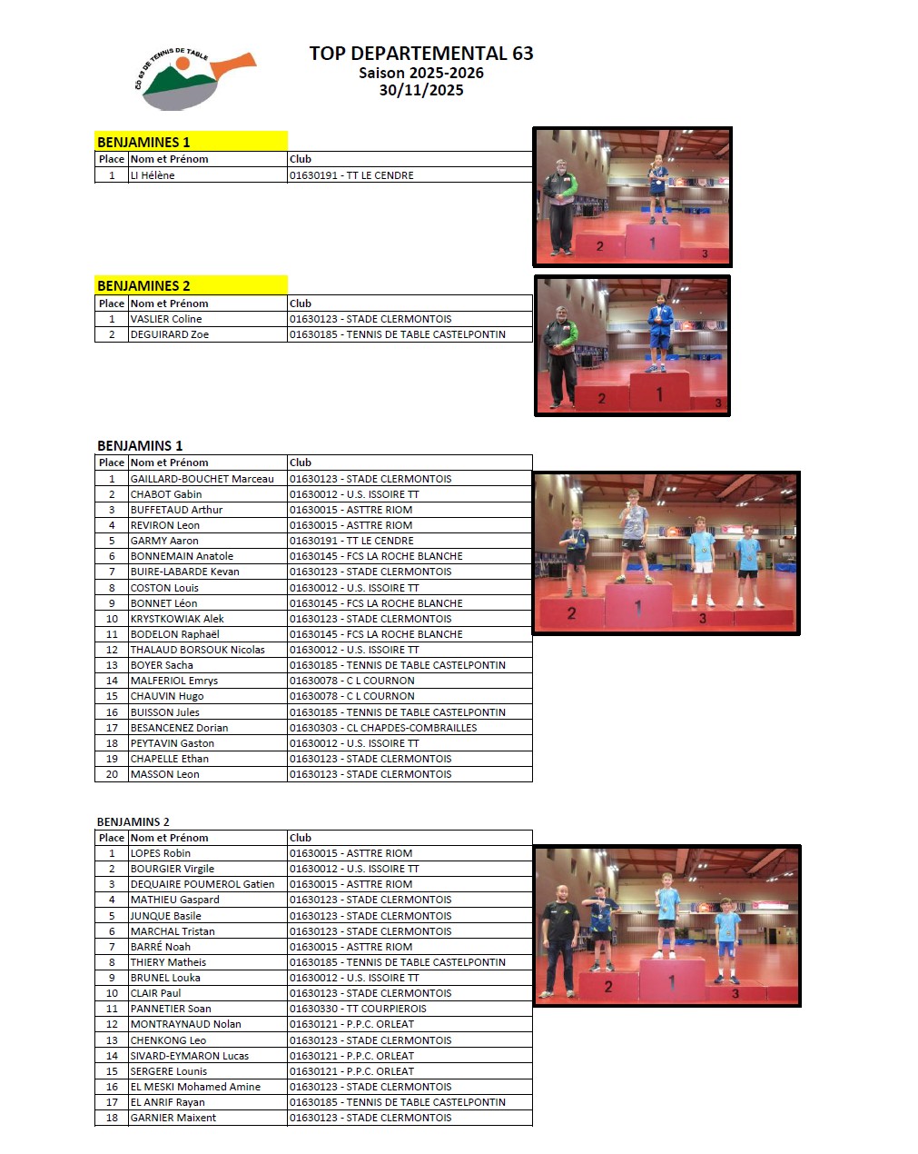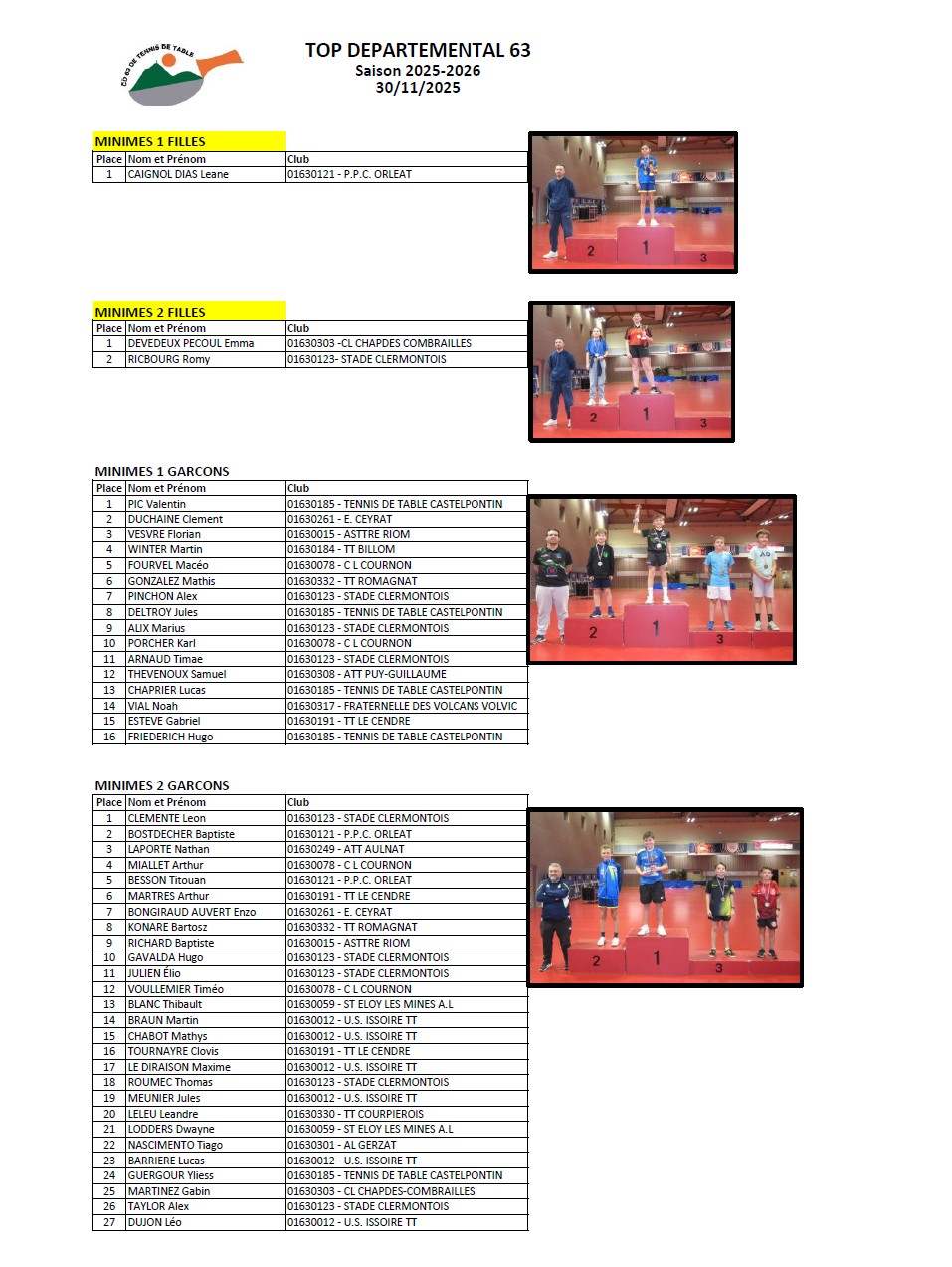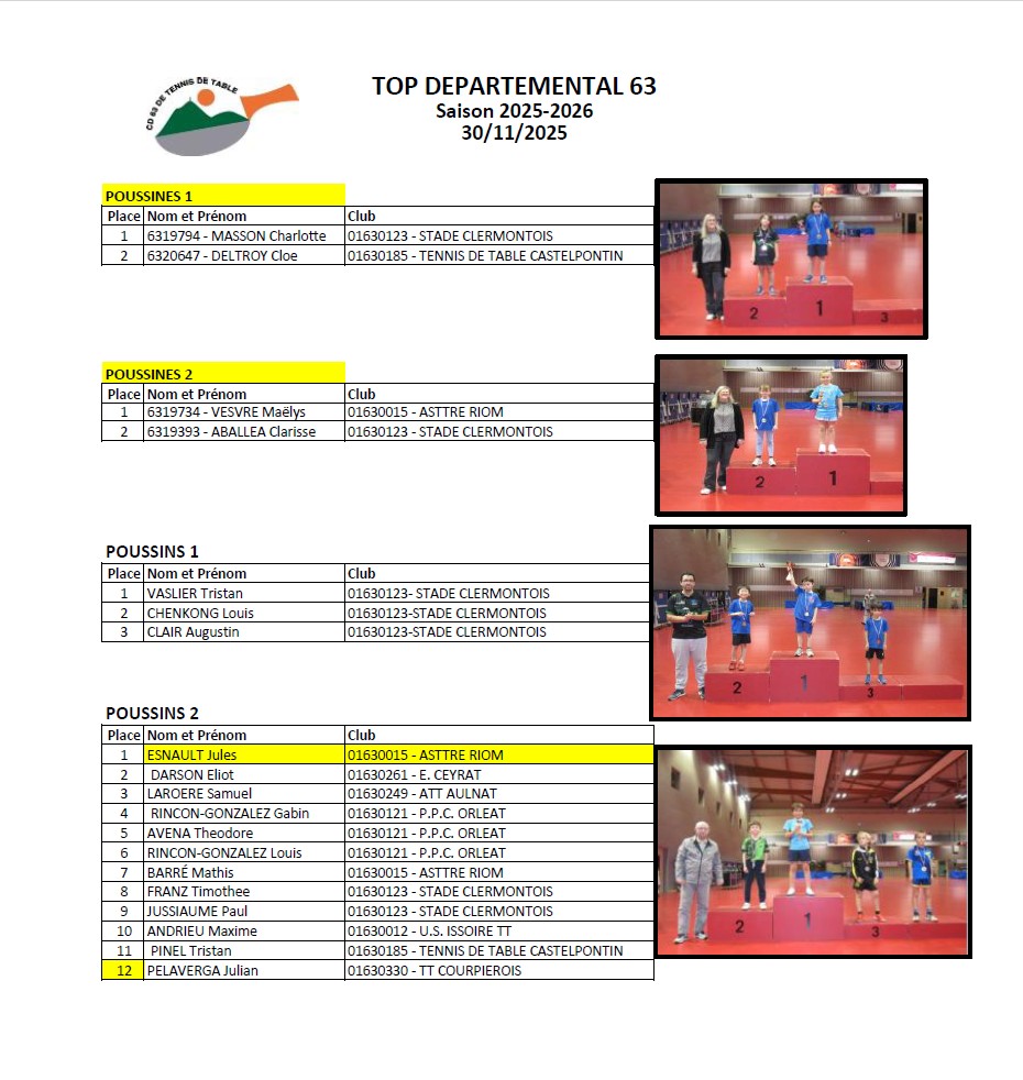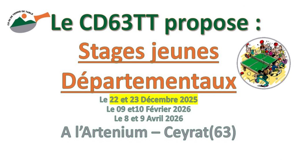 ATTENTION ! En raison de nombreuses inscriptions de dernière minute sans que le CD63TT ne soit prévenu, il est désormais impératif de vous inscrire auprès de votre club AVANT le .15/12/2025. dernier délai