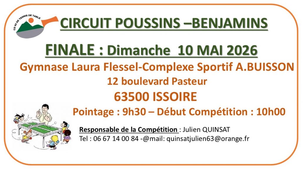 Pensez à inscrire tous vos jeunes licenciés à la Finale du Circuit Poussins-Benjamins le Dimanche 10 Mai 2026 !